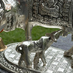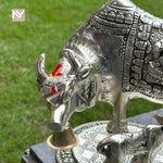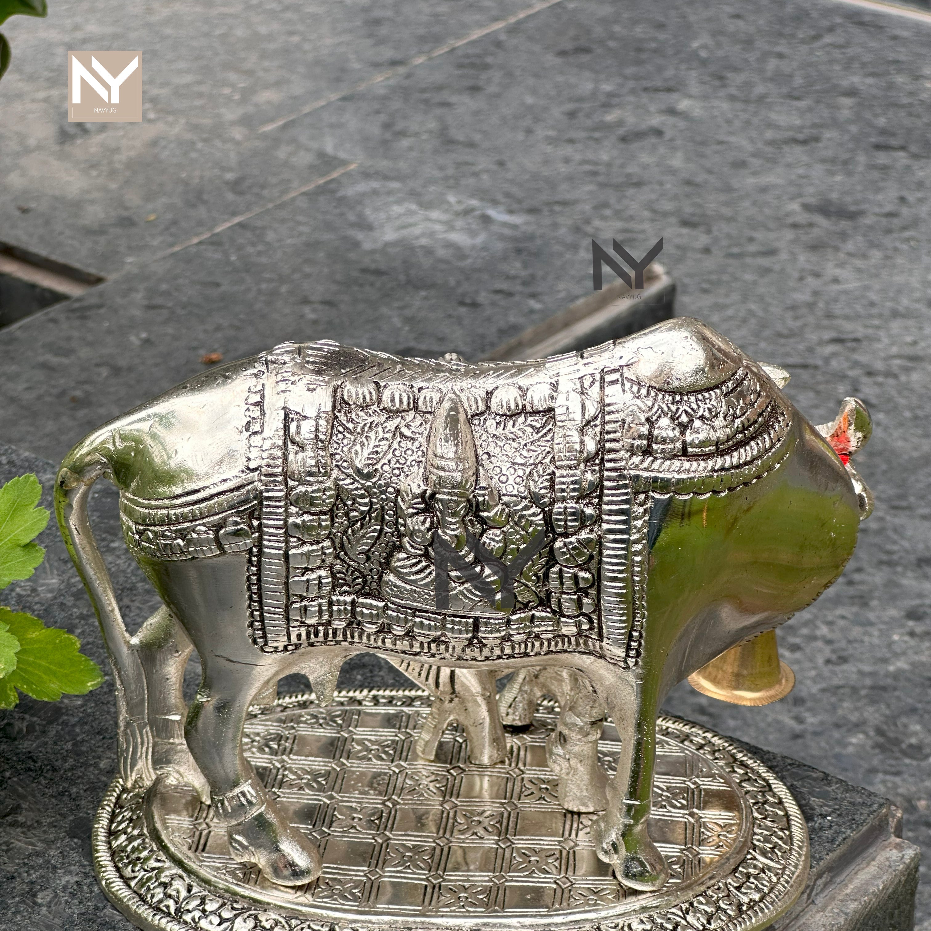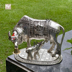 Kamdhenu cow with calf idol in a premium German silver finish—auspicious for pooja, Diwali gifting, and home decor. Intricately carved with traditional motifs on a raised oval base, symbolizing abundance and prosperity; perfect for mandirs, work desks, or festive hampers.