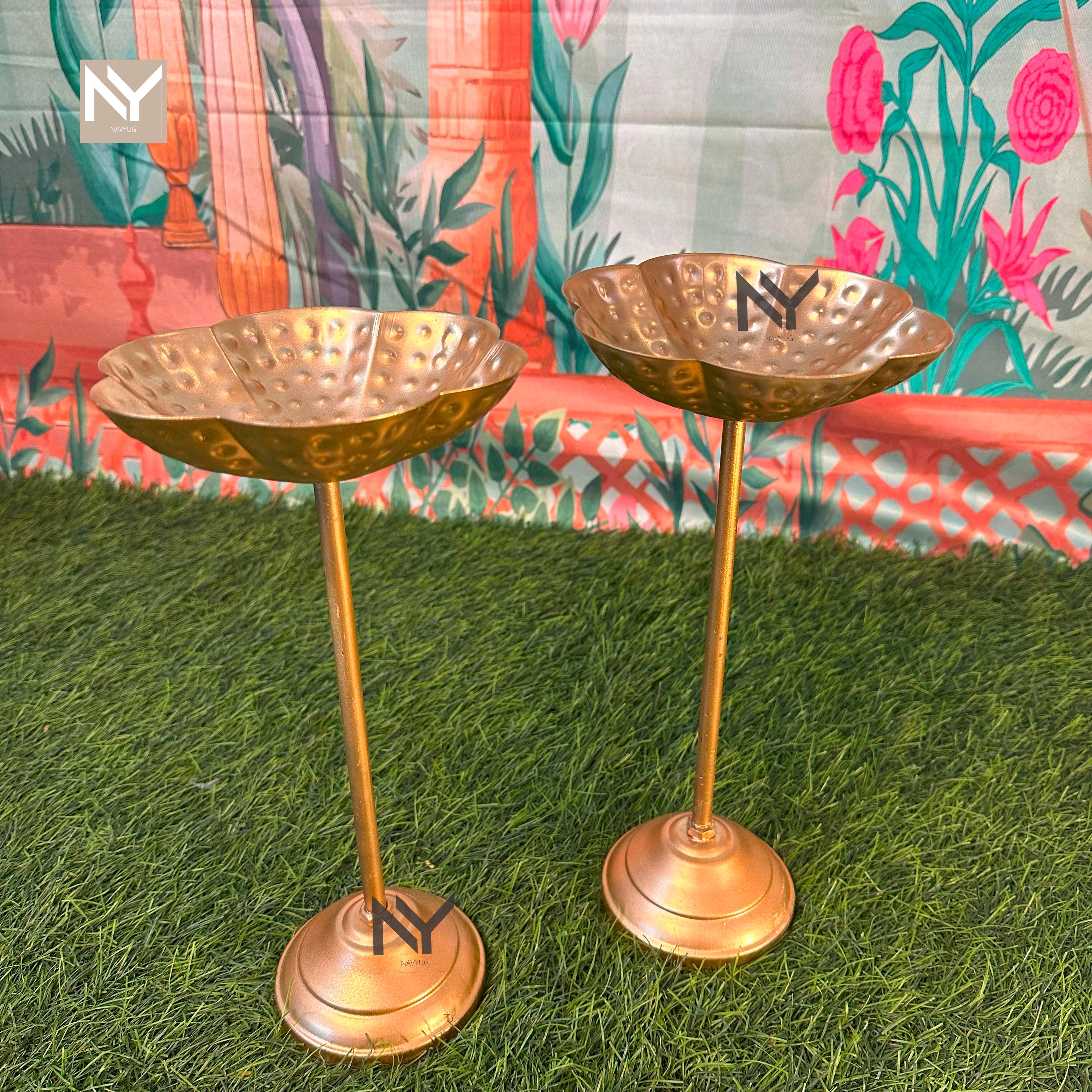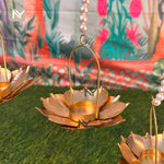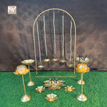 Mandap décor set with arch stand and lotus-themed accessories—perfect for pooja setups, festive entrances, and Diwali décor styling. The set features a sleek golden arch with hanging lotus tealight holders, paired with lotus pedestal votives and a central lotus urli, creating a cohesive ceremonial focal point for home mandirs, events, and gifting.