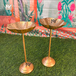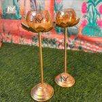 • Material: Iron with gold finish; glass votive cups included with the tall lotus stands.