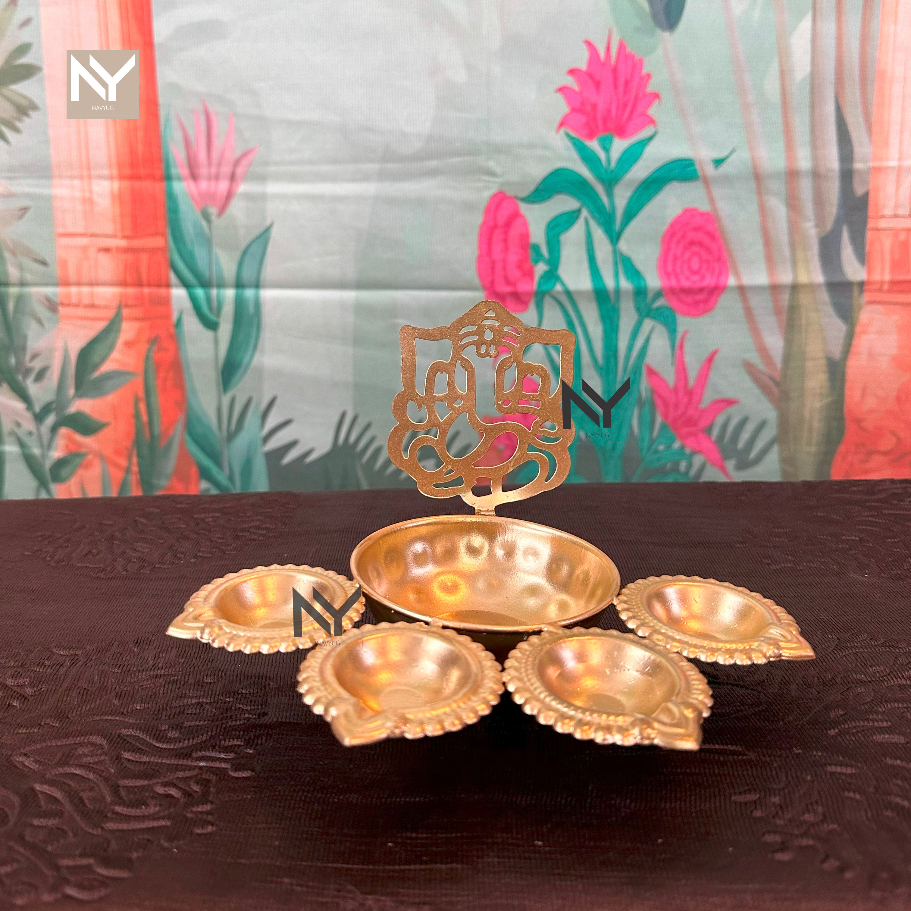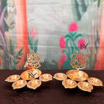 A festive diya set featuring cut‑work toppers of Lakshmi and Ganesha that cast divine shadow outlines when the lamps are lit—perfect for pooja setups, rangoli corners, center tables, and Diwali gifting. Each stand includes multiple leaf-style diyas around a central bowl, finished in warm golden tone for a radiant, auspicious glow.