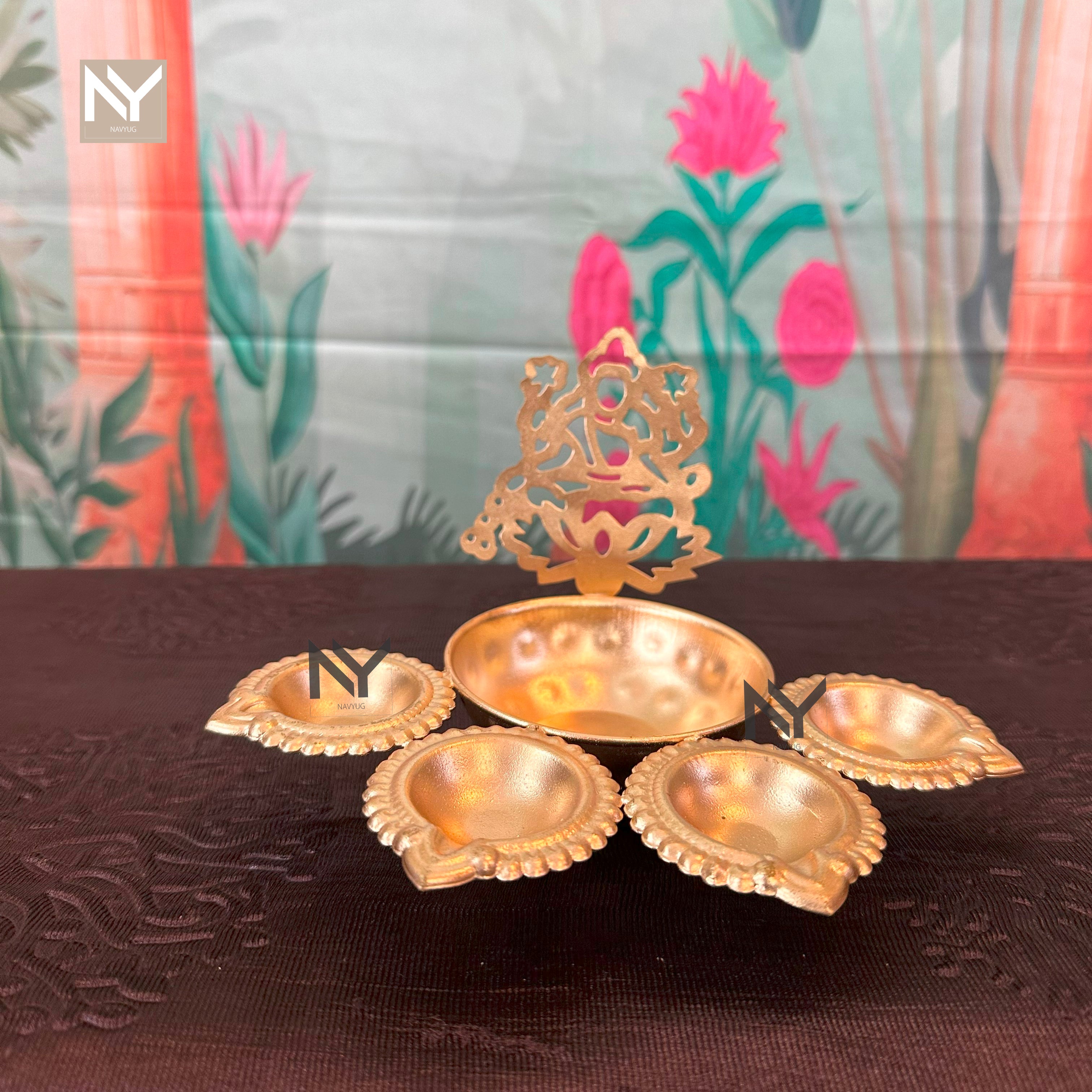 - Material: Metal with golden finish; cut‑work deity toppers; multi-cup diya base