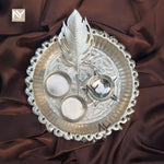 Mini tikka thali in German silver with ornate leaf motif, two katori bowls, diya, and tilak stick—ideal for pooja rituals, Diwali styling, and gifting. Compact yet elegant, it enhances temple setups and festive trays with a traditional touch.