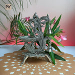Bell diya in German silver—perfect for homedecor, Diwali décor, gifting, and pooja essentials. Intricately crafted with a hanging bell and stable tripod base; compact size makes it ideal for mandirs, center tables, or festive trays to create a traditional, serene ambience.