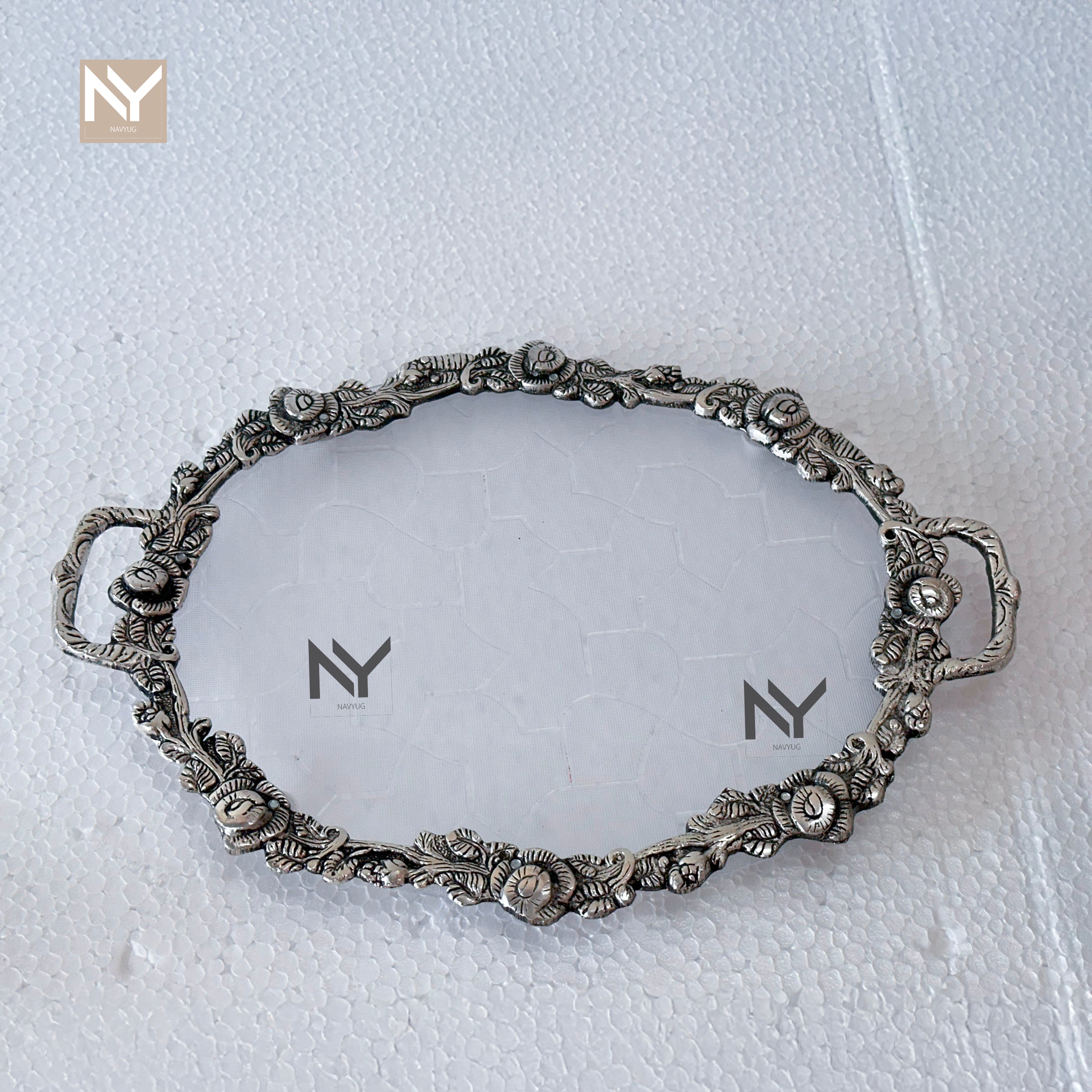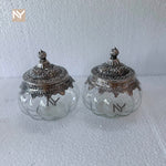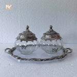 A dual-jar serving set featuring two ribbed clear-glass globes with intricately carved German silver–finish lids, presented on an oval floral‑border tray—ideal for keeping badia sa/mukhwas, mishri, dry fruits, or condiments and for festive gifting or Diwali trays. The jars have ornate finials and scalloped edges, while the tray includes coordinated handles for easy serving and styling on coffee tables, consoles, or dining setups.