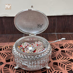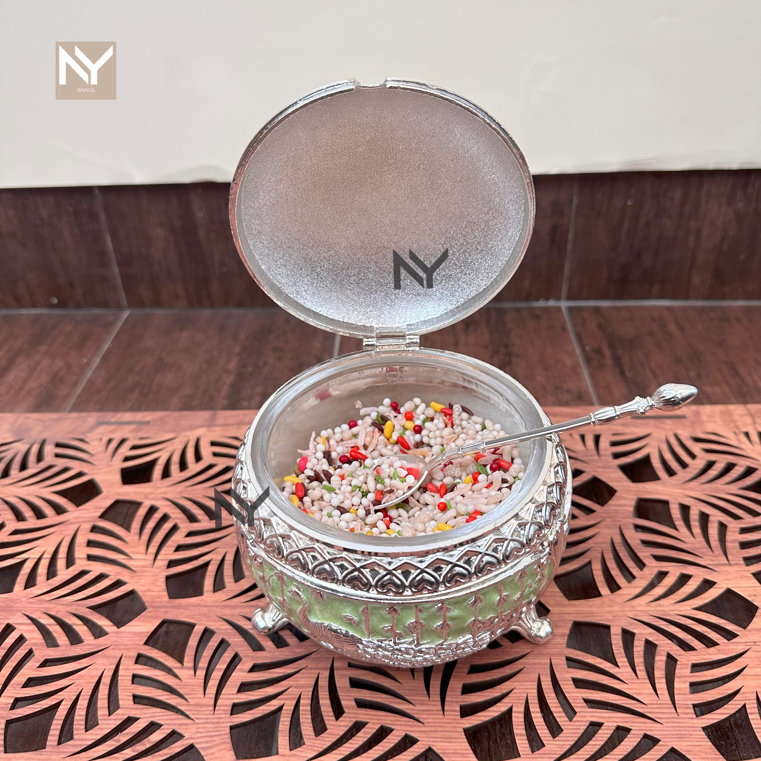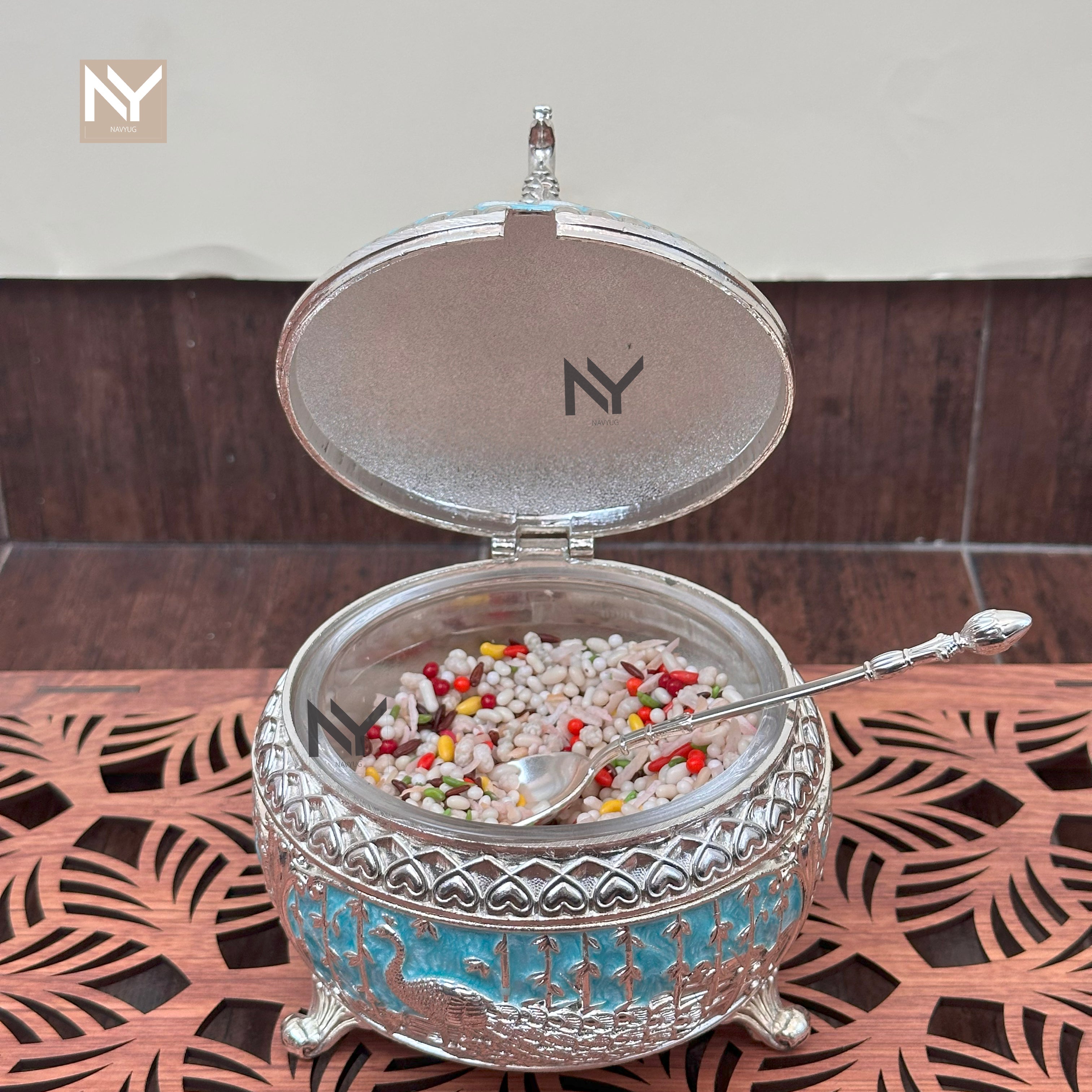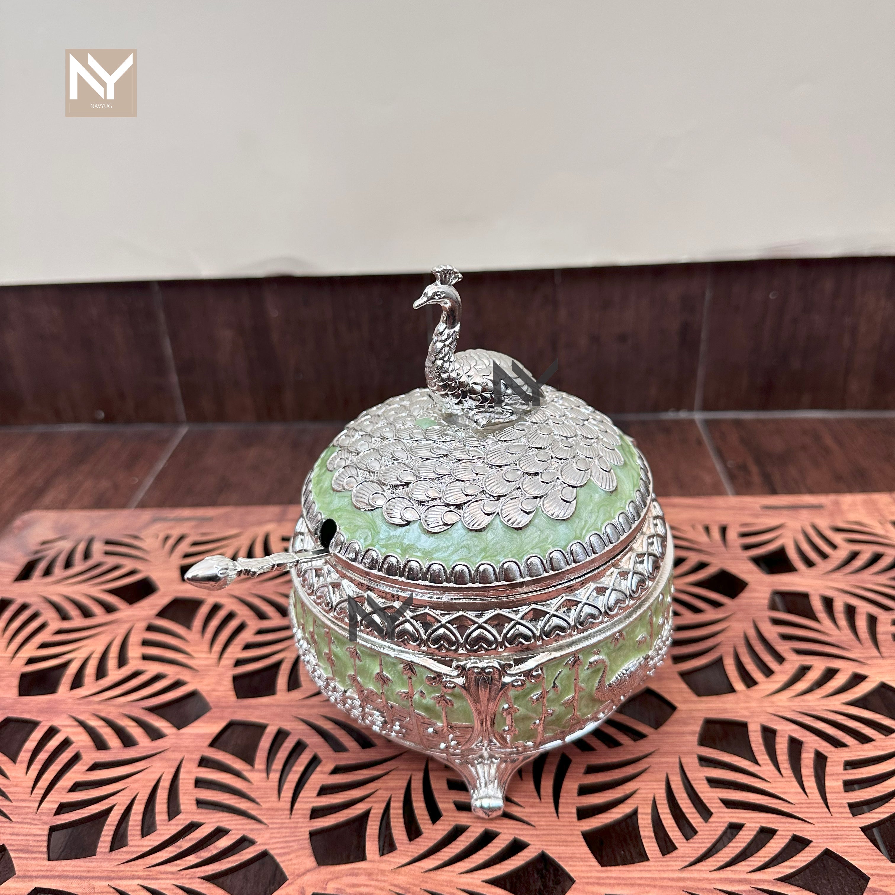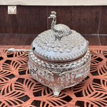 German silver peacock mukhwas bowl with spoon—a statement piece for homedecor styling, festive gifting, and Diwali trays. The domed lid features a finely sculpted peacock, while the bowl carries intricate engraving and rests on ornate feet. Perfect for mukhwas, mishri, dry fruits, or as a centerpiece on coffee tables and consoles.