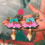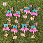 Shubh Labh lotus hangings—a vibrant pair featuring lotus motifs, Krishna flute and mor-pankh accents, and pearl tassels for festive doorways and mandir décor. Lightweight yet eye-catching, they add auspicious charm to torans, arches, pooja setups, and Diwali gifting.